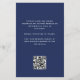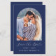 Esta simple y minimalista tarjeta Save the Date muestra una foto vertical en forma de arco encima de las palabras "Save the Date" en un elegante guión de escritura a mano en blanco, seguido por los nombres de la pareja, la fecha boda y la ciudad en letra sans serif en un fondo azul marino. Agregue un mensaje más detallado en la parte posterior, junto con un código QR para ayudar a sus invitados a visitar el sitio web de su boda.