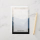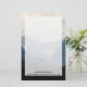 Estacionamiento con una fotografía de hermosas montañas, cielo nublado y colinas onduladas llenas de árboles en primer plano. Combinación de colores azul gris.