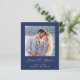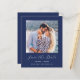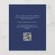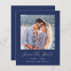 Esta simple y minimalista tarjeta Save the Date muestra una foto cuadrada encima de las palabras "Save the Date" en un elegante guión de escritura a mano en blanco, seguido por los nombres de la pareja, la fecha boda y la ciudad en letra sans serif en un fondo azul marino. Agregue un mensaje más detallado con información adicional sobre el reverso, junto con un código QR para ayudar a sus invitados a visitar el sitio web de su boda.