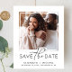 Ahorre un presupuesto económico económico ahorrando la tarjeta de anuncio de fecha que incluye tu foto en un marco cuadrado cortado y una tipografía moderna mínima con un toque de escritura elegante. Personalice su nombre, fecha de boda y ubicación. Al contrario, personalizar los detalles de la fecha y agrega los nombres en un script similar a la firma.