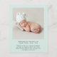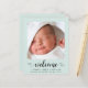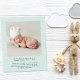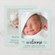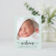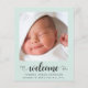 Un simple anuncio de natalidad verde y neutra con respecto al presupuesto, diseñado con menta pastel. La parte delantera incluye la foto del recién nacido, su nombre, fecha de llegada y estadísticas de nacimiento, y "bienvenido" en un guión elegante con latidos cardíacos. Al contrario, agregue una foto adicional, nombres de padres y hermanos y un mensaje personalizado de agradecimiento u otro.