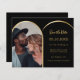 Una foto Guardar la fecha para su boda. Al frente: Añade tu propia foto de tamaño vertical. Un marco falso de fotos en oro. Un fondo negro clásico, texto dorado. Personaliza y agrega tus nombres y la fecha. 1 hoja = 1 Guardar el borde impreso de fecha en borde.