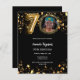 Una moderna y elegante invitación fotográfica para una fiesta de cumpleaños número 70. Un fondo negro clásico, decorado con falsas estrellas doradas. Personalice y agregue los detalles de su fiesta. 1 hoja = 1 borde impreso de invitación al borde.