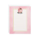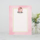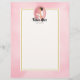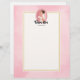 Letterhead con el texto: Futuros mrs, con su nombre personalizado. Ilustrado con una feliz novia sonriente de cabello marrón. Lleva un vestido blanco boda y sostiene un ramo de flores con un velo de bonito en el pelo. Se coloca dentro de un marco de cámara ovalado rosado con un borde de vieira. Una suave acuarela rosa para el fondo con un rectángulo de color crema sobre la parte superior con un borde de color dorado.