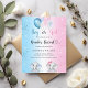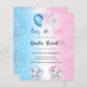 For a gender reveal baby shower. A blue white and pink gradient background. Decorated with glitter and blue, pink and white balloons and glitter dust. A baby boy elephant and a gaby girl elephant. Personalize and add the names of parents to-be and party details. The name and the text: Boy or Girl are written with a hand lettered style script.