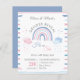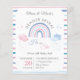 Una ducha de bebé o un género económico revelan la invitación. En un fondo rayado rosa, azul y blanco, un lindo arco iris rosa y azul, junto con nubes y estrellas de lluvia, está flanqueado por un texto tipográfico curvo que dice Revelación de Género, y él o ella, ¿qué será el bebé?. Personalice agregando todos los detalles del evento y del contacto.