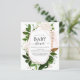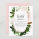 Agua Botánica y Oro Rosa para la Verdemia Presupuestaria - Invitaciones a la ducha de bebé de la primavera geométrica rosada de Rubor sobre fondo blanco - incluye una tipografía de escritura hermosa y elegante con hojas botánicas modernas y vegetación para la celebración especial de la Madre a Ser.