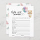 "Podemos esperar con premura". ¡Celebra con este fiesta de ducha de bebé con temática de oso de peluche! Acuarela lindo oso de peluche con globos de colores. Fondo de fondo con cielos color azul-rosado. Elementos coincidentes disponibles. RESPUESTAS: REVUELTAS, LLORACIÓN, PACIFICADOR, BOTELLA, LUZ NOCTURNA, LULLABY, ESPÍRITU, EPIDURAL, BURP, SILLA ALTA, BOLSA DE DIAPER, ESPADA