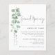 Invitación de apertura de la tienda de la empresa Budget Eucalyptus. Un precio económico menor 4,5" x 5,6" alternativa. Disponible en un ALMACENAMIENTO DE TARJETAS SEMI GLOSS 110 lb que es la opción por defecto (similar al grosor de una postal, recomendada para las invitaciones), O UN ALMACENAMIENTO DE PAPEL LADRÓN SATIN FINISH 80 lb (ideal para los gabinetes). estilo botánico minimalista, con una vegetación acuarela que fluye por el lado izquierdo y texto a la derecha. Un guión informal para Grand Opening y el resto del texto que puede personalizar fácilmente.