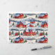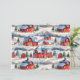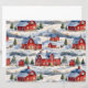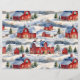 Un hermoso patrón de invierno con una escena de invierno campestre con graneros cubiertos de nieve rojas.