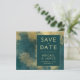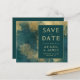 Esta elegante tarjeta de Guardar la fecha de boda presenta un moderno fondo abstracto de acuarela en azul teal y dorado. Personalice el texto dorado en fuentes elegantes sobre un rectángulo azul oscuro, y agregue la URL de su sitio web de boda en la parte posterior de color azul sólido.