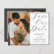 Comience la planificación de su boda con estilo con esta elegante y minimalista tarjeta de fecha. Con un gran guión de "Save the Date" intemporal en gris oscuro sobre un fondo blanco nítido, este diseño incluye una plantilla de fotos de personalizable, perfecta para mostrar su imagen de compromiso favorita. Ideal para los temas bodas modernos, clásicos o románticos. Totalmente editable para adaptarse a sus detalles únicos y crear una primera impresión duradera.