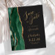 El borde izquierdo de esta elegante y moderna boda, salvo la tarjeta de fecha, cuenta con un borde de batido de color verde esmeralda recortado con un falso purpurina de oro. El texto de personalizable combina secuencias de comandos de color dorado y fuentes sans serif en un fondo negro de pizarra. El reverso presenta un diseño de agate verde y dorado a juego.