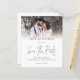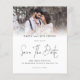 NOTA Hay dos opciones de papel entre las que elegir para este tamaño (4,5 x 5,6") en el rango de presupuesto. Para este producto, recomendaría en gran medida el semi brillo que es una tarjeta de 110 gsm, similar en grosor a una postal. La opción Satin es un papel mucho más delgado 80gsm. El valor predeterminado se establece en semi brillo. ***NOTA: HAY UNA invitación por hoja. Guión de superposición de fotos de presupuesto Guardar la fecha está en un guión moderno. Reemplace la foto de ejemplo con su propio favorito.