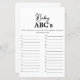 ¿Qué artículo de bebé comienza con cada letra? ¡La primera persona en completar la lista gana! Un alegre juego de ducha de bebé con una narrativa básica.