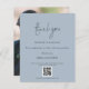 Script QR Code Boda Photo Gallery Dusty Blue Gracias. Un precio económico menor 4,5" x 5,6" alternativa. Disponible en un ALMACENAMIENTO DE TARJETAS SEMI-GLOSS de 110 lb que es la opción predeterminada (más grueso para las invitaciones), O UN ALMACENAMIENTO DE PAPELES DELGADOS SATIN FINISH DE 80 lb (ideal para los gabinetes). Los sobres son un extra opcional y son algo más grandes que el tamaño de la tarjeta. Un minimalista diseño de tipografía con un elegante guión estilo escritura a mano para Gracias. En la parte posterior, reemplace la fotografía de muestra con su favorita del día como un regalo para sus huéspedes. Personaliza fácilmente el resto del texto con tu mensaje y nombres y reemplaza el ejemplo de código QR con tu propia imagen de boda en línea.
