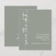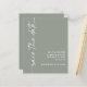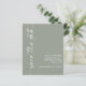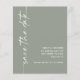 Caligrafía minimalista Código QR Boda verde sabia Guardar la fecha. Un precio más bajo de 4,5 x 5,6" alternativo en 110 gsm semi brillo similar en grosor a una postal. Código QR opcional para el sitio web del boda en la parte posterior que se generará automáticamente cuando cambie la URL del ejemplo a su propia URL del sitio web o elimine el código de ejemplo si no fuera necesario. La caligrafía estilosa está rotada a la izquierda, con todos los detalles a la derecha, con mucho espacio blanco para un ambiente contemporáneo. Personalice fácilmente con sus detalles. Y cambie el color del texto y del fondo si lo desea a través de la opción de edición adicional.