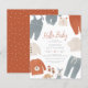 Una invitación moderna y bonita a la ducha de bebé con "Hello Baby" en letras de escritura terracota y los detalles de tu ducha en una tipografía simple. La decoración está muy lograda, con ropas de bebé de colores neutros en azul pastel, crema y naranja de óxido. La ropa incluye overoles, un enterizo, pantalones, una abeja, zapatos de bebé, una camisa y un suéter. También hay un pequeño dinosaurio de madera y un juguete de zorro. Invita a revertir un patrón simple de triángulo blanco escandinavo contra un fondo naranja. Este armario lo tiene todo, así que esta invitación es perfecta para los bebés de primavera, verano, otoño e invierno. "Como parte de la selección de presupuesto en Zazzle, esta hoja no es un tamaño de invitación estándar ni calidad de papel. Si quieres este diseño en una tarjeta de invitación, puedes encontrarlo en nuestra tienda o usar la Máquina Zazzle Make para transferirlo al producto de tu elección. Siéntete libre de contactarme si tienes alguna pregunta - estaré encantado de ayudar. Visita nuestra tienda para más diseños!