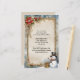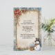 Un muñeco de nieve a la vieja usanza con una bufanda y un sombrero superior parado en un banco de nieve al lado de un regalo de Navidad envuelto en esta encantadora invitación a la fiesta de los Navidades. Hermosa escena rústica, y perfecta para sus vacaciones. Eliminar el texto y hacer el papel perfecto de boletín de vacaciones.