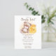 Cariño, oso de peluche con jarra de miel espera la invitación a la ducha de bebé.