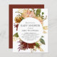 Una encantadora invitación rústica a la ducha de bebé con un ramo de flores acuáticas en tonos de paprika, naranja, burdeos, marrón, dorado, rosa, melocotón, óxido, marfil y crema que rodean el gris oscuro en un círculo blanco. Lo contrario es un tono de burdeos. Ideal para una ducha de bebé en otoño.