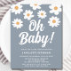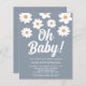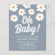 ¿Estás planeando una ducha de bebé para niños? Esta invitación a la ducha de bebé barata está decorada con margaritas hechas a mano y Oh Baby! en una tipografía retro blanca con un fondo azul. Personalizable fácil. Dibujo original © Michele Davies.