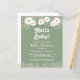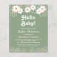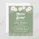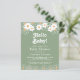 Esta invitación a una ducha de bebé neutra de género está decorada con daisies y tipografía elegante en un elegante fondo verde.
