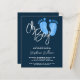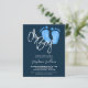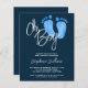 ¿Estás planeando una ducha de bebé para niños? Estas invitaciones modernas a la ducha de bebé de bajo presupuesto están decoradas con Oh Boy! en una tipografía de escritura elegante y los pies de bebé de color agua tierno en azul pastel sobre un fondo azul marino. Personalizable fácil. Acuarela original © Michele Davies.