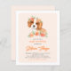 Invite a los huéspedes a su evento con esta invitación a la ducha para bebés de personalizable. Cuenta con ilustraciones acuáticos de un bonito Cavalier Rey Carlos Español y flores de melocotón. Personalice agregando sus detalles. Esta encantadora invitación a los colonos fronterizos es perfecta para cumpleaños, duchas de bebé y otros eventos.