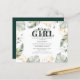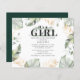 Una invitación a la ducha de animales salvajes, tranquilos y elegantes de safari con una jirafa, efecto dorado y hojas verdes. Perfecto para chicas invitaciones a la ducha de bebé