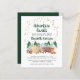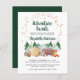 Invitación rústica y económica a la ducha virtual de bebé con un lindo ilustracion de animales de bosque con su tienda acampando en las montañas y el bosque, un overlay de las estrellas de oro y "Adventure Awaits" y el nombre de la futura madre en un guión verde oscuro para cazadores. Personalice fácilmente los detalles de la ducha y agregue un enlace en línea o número de texto o dirección de correo electrónico para obtener el enlace.