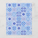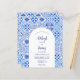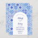 Este diseño rústico presenta un patrón de fondo de azulejos portugueses de color azul y blanco, o azulejos. Personalízalo con los nombres de la novia y el novio en escritura caligráfica azul y el texto restante en una combinación de sans serif, copperplate y cursiva en forma de arco blanco. En el reverso aparece un patrón de mosaico coincidente.