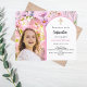 Añade tu propia foto de tamaño vertical. Marco fotográfico en forma de arco rosa. Un color de fondo blanco. Decorada con flores rosas y una cruz dorada. Personalice y agregue un nombre y detalles. 1 hoja = 1 borde impreso de invitación al borde.