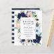 La invitación a la ducha con motivos florales de novia con temática náutica incluye flores de color azul marino pintadas a mano y de color rosa con vegetación acentuada por las estrellas de oro. Personalice los detalles de su fiesta en la tipografía moderna de escritura azul. La parte posterior de la tarjeta tiene una textura de color de rayas azules y blancas. Diseñado por Susan Coffey.