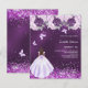 Para un elegante cumpleaños de Sweet 16. Un fondo morado desigual. Decorada con confeti, mariposas, rosas y un chica vestido. Personalice y agregue un nombre, edad/texto y detalles del fiesta. El nombre se escribe con un guión de estilo con letras a mano. 1 hoja = 1 borde impreso de invitación al borde.