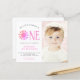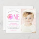 Invite a su familia y amigos a su primera fiesta de cumpleaños con esta encantadora invitación de presupuesto para el primer cumpleaños. Está decorado con un sol de color rosa y dice "Nuestro pequeño sol es uno" personalizable fácil. Reemplace la foto por una de las suyas. Perfecto para una fiesta de cumpleaños de chica. Utilice la Herramienta de diseño para cambiar el tamaño, estilo o color del texto. A medida que creamos nuestra obra de arte no encontrarás esta imagen exacta de otros diseñadores. Acuarela original © Michele Davies.