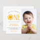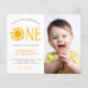 Invite a su familia y amigos a su primera fiesta de cumpleaños con esta encantadora invitación de presupuesto para el primer cumpleaños. Está decorado con un sol de color amarillo y dice "Nuestro pequeño sol es uno" personalizable fácil. Reemplace la foto por una de las suyas. Perfecto para una fiesta de cumpleaños de niño o chica. Utilice la Herramienta de diseño para cambiar el tamaño, estilo o color del texto. A medida que creamos nuestra obra de arte no encontrarás esta imagen exacta de otros diseñadores. Acuarela original © Michele Davies.