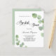 Un fondo blanco decorado con brotes de eucalipto. Personaliza y el nombre de la novia a ser y los detalles del fiesta. Atrás: fondo verde.
