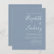 Esta sencilla y moderna invitación a la boda incluye texto blanco sobre un polvoriento fondo azul. Añada los nombres de la novia y del novio en una caligrafía elegante de escritura a mano y los detalles en letra sans serif. El reverso es un tono de azul sólido y polvoriento. NOTA: Los sobres no se incluyen automáticamente con estas invitaciones presupuestarias, así que por favor recuerde elegir la opción "sobres blancos".