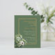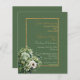 Invitación a la boda del PRESUPUESTO en una hoja de papel con un encantador ramo de rosas verdes y tema floral blanco y marco dorado.
