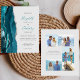 El borde izquierdo de esta elegante y moderna invitación a la boda incluye un verde azulado borde de ágata color azul azul adornado con un falso purpurina de plata. El texto del personalizable combina el guión verde azulado de escritura a mano con el copperplate gris carbonífero y las fuentes cursivas en un fondo gris pálido. El lado inverso proporciona espacios para 4 fotos (1 cuadrado, 2 horizontal, 1 vertical largo) y espacio para la URL de su sitio web boda u otra información.
