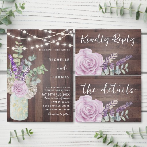 Diseño de inspiración rústica con obras de arte originales de rosas, lavanda y eucalipto en un frasco de albañil vintage. Los elementos artísticos y las luces de cuerda están sobre un fondo falso de madera con caligrafía en blanco.