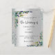 Fondo falso plateado decorado con vegetación eucalipto, follaje dorado y purpurina de imitación plateado y verde, chispas. Personalice y agregue sus nombres y detalles del boda. Cartas negras.