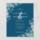 Invitación nupcial moderna. Con flores de follaje rústico y pequeñas flores azules en un fondo azul Egeo. Fácil de personalizar con su información única.