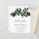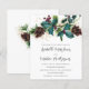 Fresas azules y rojas, ramas de pino y conos de pino están rodeados de espuma dorada para crear una rústica y elegante invitación a la boda botánica de invierno.
