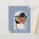 Moderna invitación a una boda azul polvorienta y económica con una foto en un marco de arco y "Feliz eterno después" en una elegante tipografía blanca. Agregue sus nombres, fecha de boda y ubicación. Al revés, personaliza tu invitación en una tipografía blanca simple.