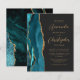 El borde izquierdo de esta elegante y moderna invitación a la boda incluye una verde azulada barra acuática recortada con un falso purpurina de oro. El texto de personalizable combina secuencias de comandos de color dorado y fuentes sans serif en un fondo negro de pizarra. El reverso presenta un diseño de agate verde azulado y dorado a juego.