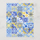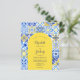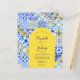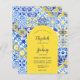 Este diseño rústico presenta un patrón de fondo de azulejos portugueses azules, amarillos y blancos, o azulejos. Personalízalo con los nombres de la novia y el novio en escritura de caligrafía azul y el texto restante en una combinación de sans serif, copperplate y cursiva en forma de arco amarillo. En el reverso aparece un patrón de mosaico coincidente.