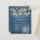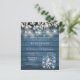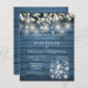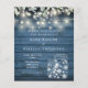 Una elegante invitación a bodas de bajo presupuesto con luces de cuerdas de bonito, jarras de albañil y hojas de salvia y lila que caen sobre un fondo azul rústico de madera. Diseñado por Thisisnotme©