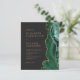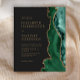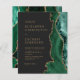 El borde derecho de esta elegante y moderna invitación a la boda incluye una pasarela de color verde esmeralda bordeada por un falso purpurina de oro. El texto del personalizable combina fuentes serias, copperplate y cursivas de color dorado en un fondo negro de pizarra. El reverso presenta un diseño de ágata dorado y verde esmeralda a juego.